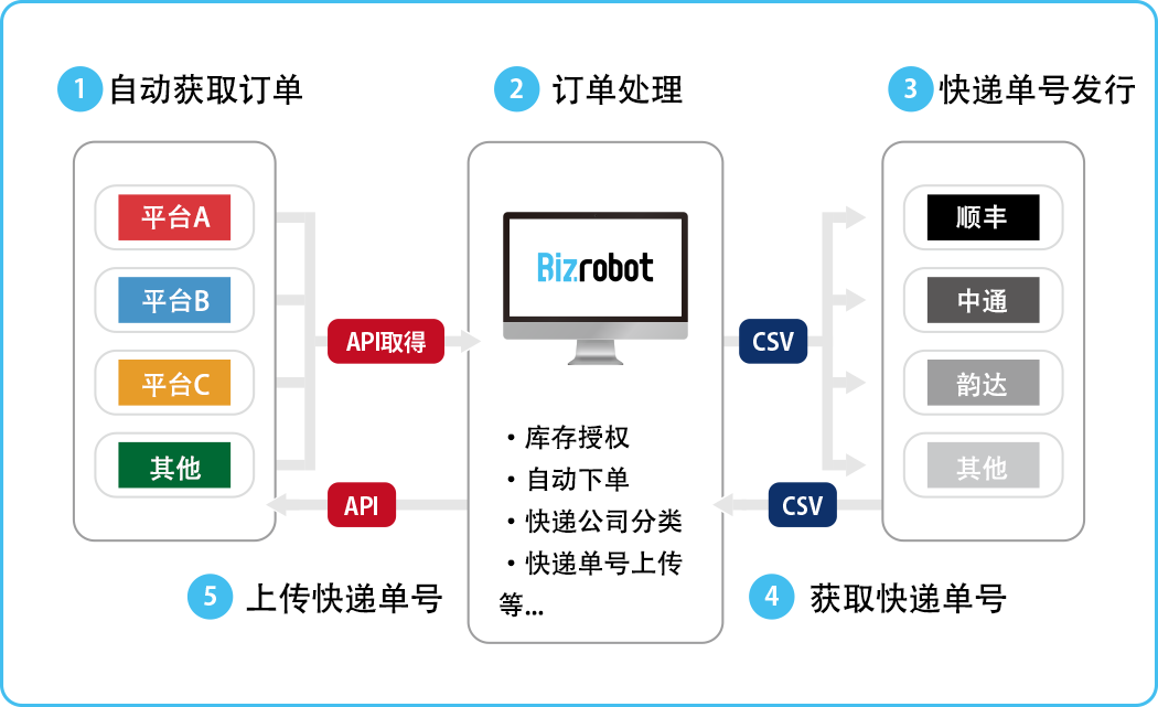订单管理系统 支持集中管理多个店铺的订单!通过EC运营的自动化,实现高效化! 自动读取订单、批发也可同时管理 多个店铺的订单都能集中管理! 您是否存在以下烦恼? Do you have any of these problems? 需要登录每一个平台,操作麻烦 订单增加忙不过来 需要利到CVS操作,比较麻烦 需要手动输入发货单号 功能 Function 自动获取订单 每个店铺的订单都将自动导入到Bizrobot。 自动化订单处理操作 导入到Bizrobot上的订单实现可出货状态的自动化管理。 发货流程的高效化 可出货状态的订单可按顺序依次发货。 发货后自动跟进 自动上传发送方式以及快递单号。 ※需要获取每个店铺的API。 支持的平台 Correspondence mall 可支持的其他平台正在逐步开放中! 适用于各类商家 Available from various manufacturers 品牌服装 健康食品保健品 化妆品 酒食品 家电 家具杂货 其他行业也可适用,欢迎随时咨询! 从售前咨询到售后跟进,我们都将全程为您服务! We will support you from consultation before introduction to follow-up after operation. More information Let’s get started